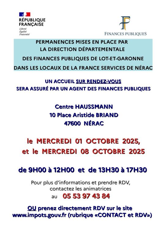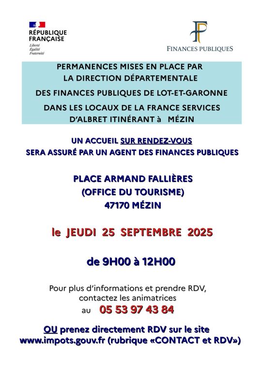 Les dates  : MEZIN : Jeudi 25 septembre 2025 de 9h à 12h - NERAC : Mercredi 1er octobre 2025 et mercredi 8 octobre 2025 de 9h à 12 h et de 13h30 à 17h30.