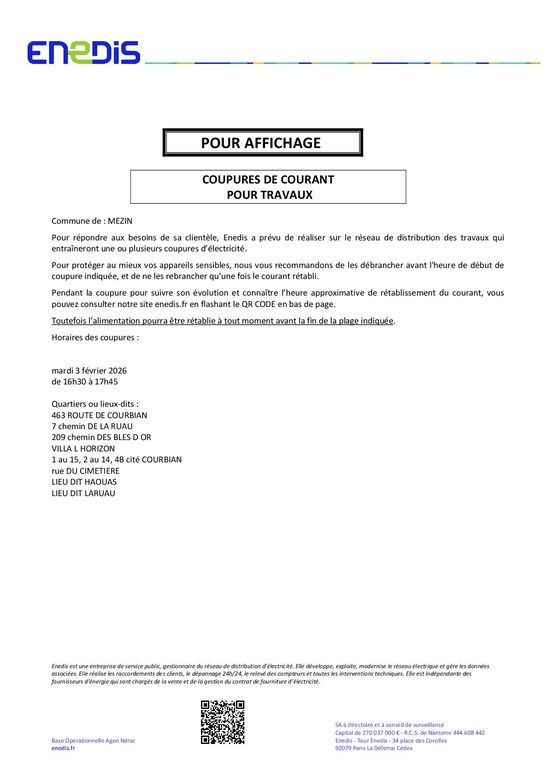 COUPURES DE COURANT POUR TRAVAUX - 3 février 2026